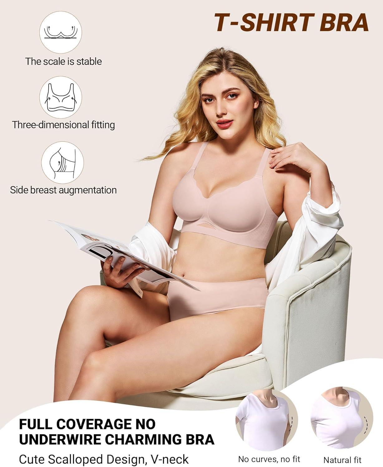 HORISUN No Underwire Bras for Women Push Up Scalloped V Neck Wireless Full Coverage Bralette Supportive Comfort Everyday Bras(Pink)