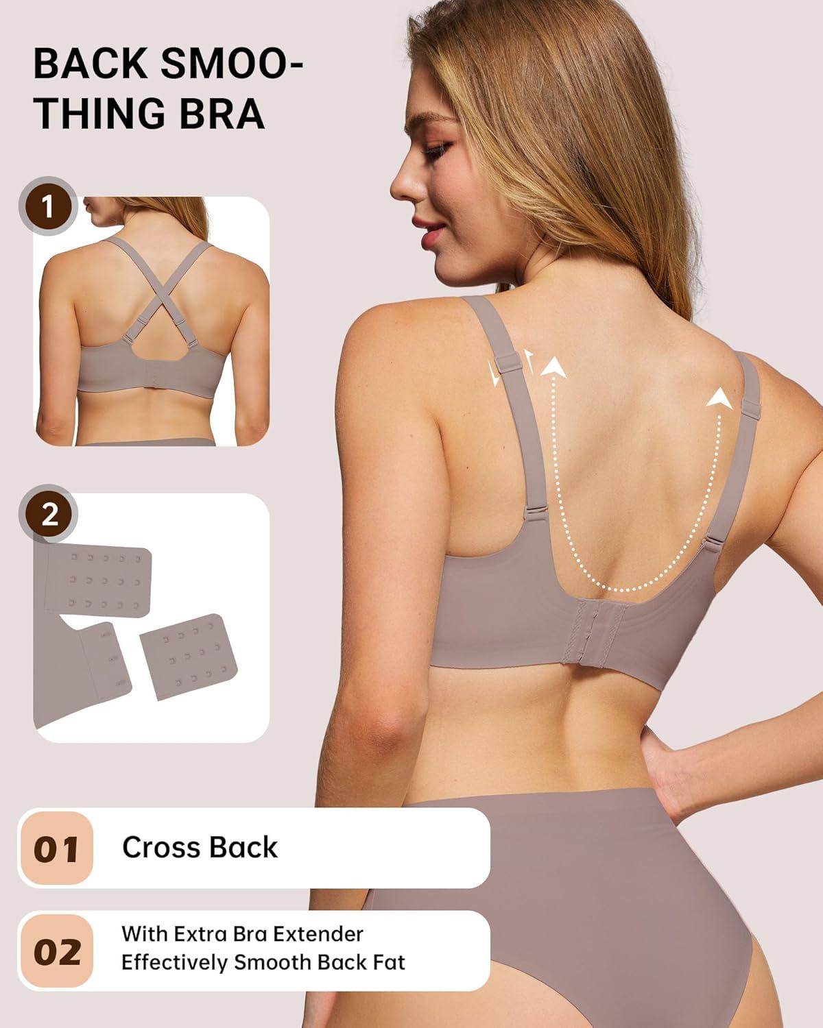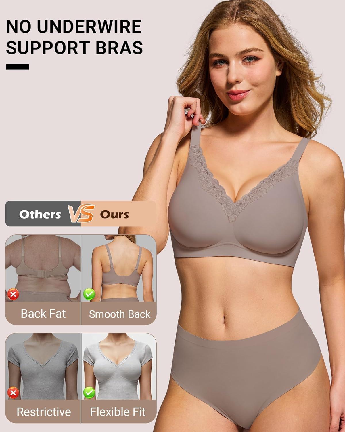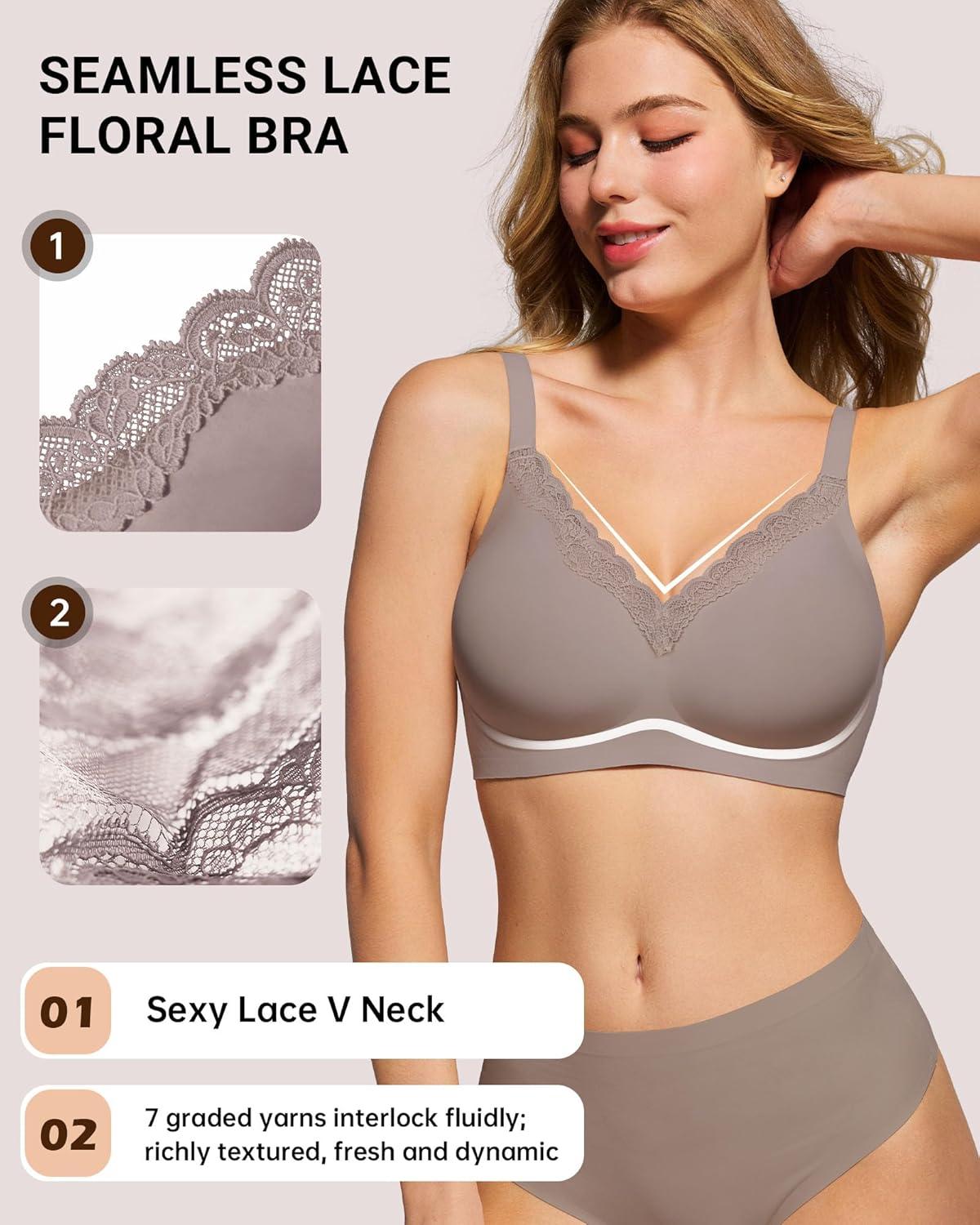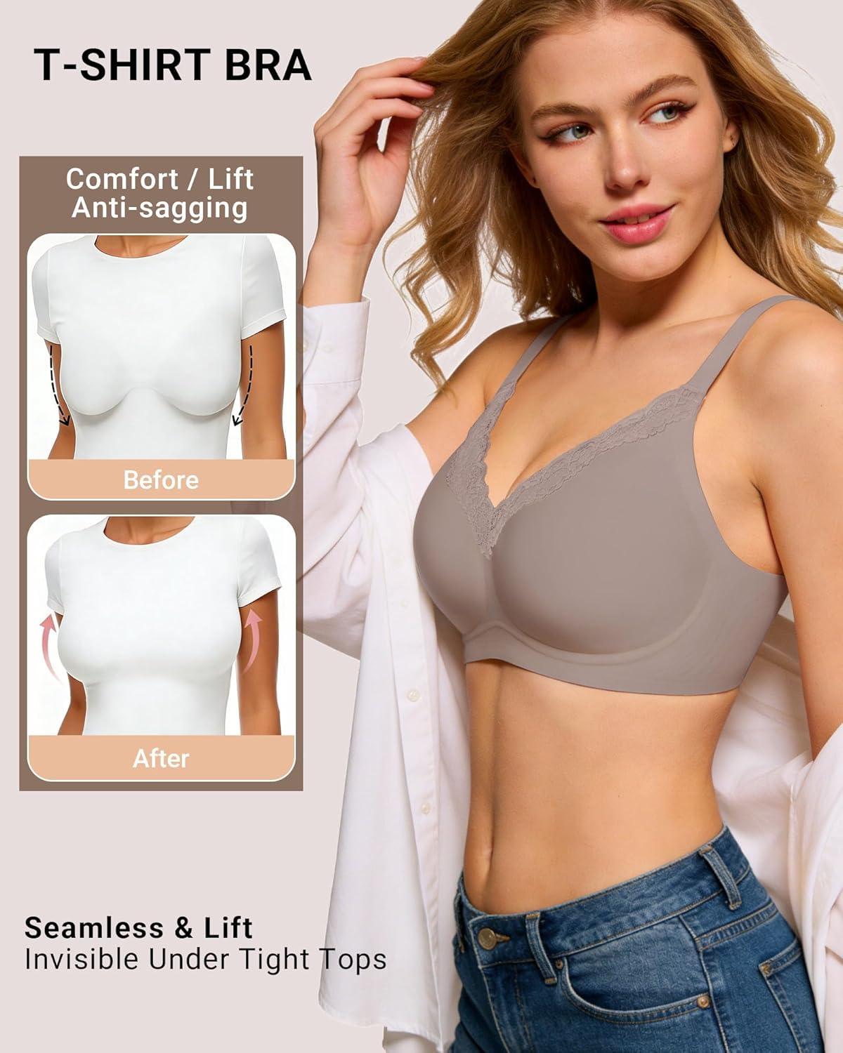 HORISUN Wireless No Underwire Bra for Women V-Neck Lace Trim Jelly Supportive Seamless Bra Comfortable Tshirt Bralette(Coffee)