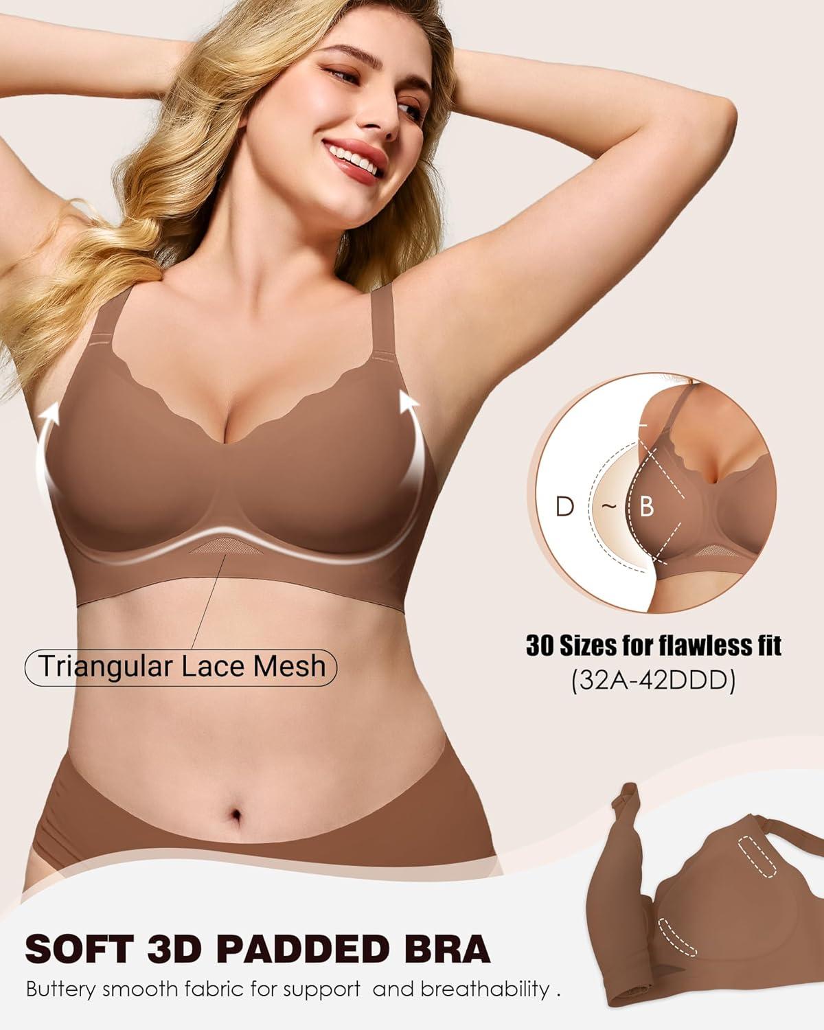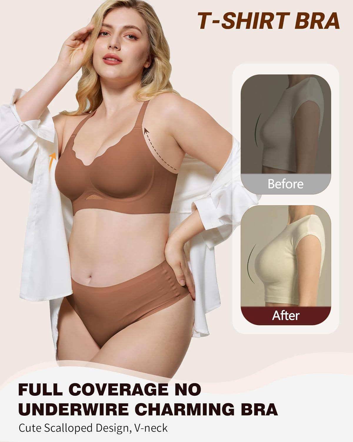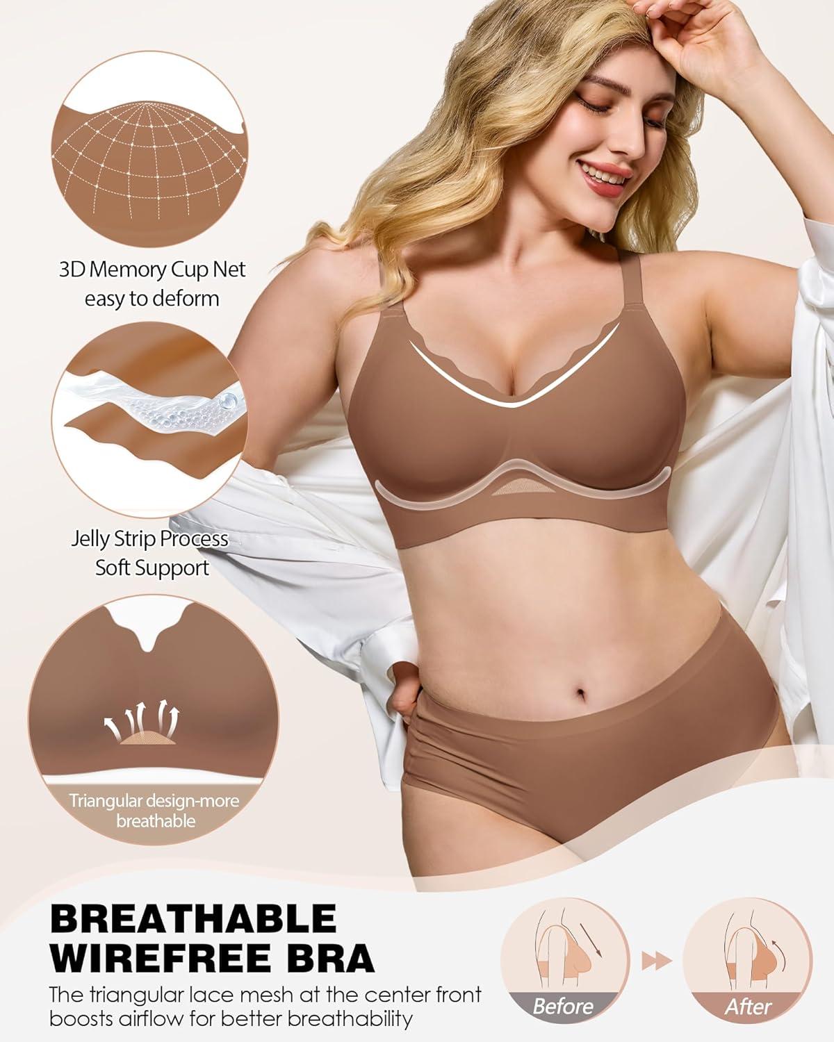 HORISUN Women’s Wireless Push Up Bralette – No Underwire Scalloped V-Neck Full Coverage Soft Support Bra(Coffee)